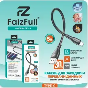 Кабель FaizFull FR140 быстрый заряд 5A, 30 см, огнеупорный силикон, черный