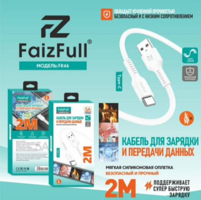 Оцените удобство и надёжность кабеля FaizFull FR46: его мягкая силиконовая оплётка обеспечивает комфорт при ежедневном использовании, а огнеупорный материал гарантирует дополнительную защиту и спокойствие. Поддержка супербыстрой зарядки током до 5А позволяет экономить ваше время, когда требуется зарядить устройство максимально быстро.