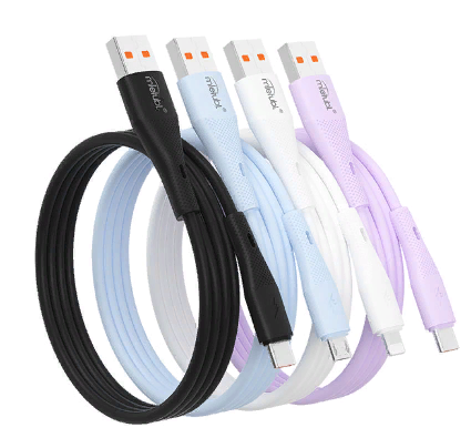 Кабель имеет гладкую, круглую форму и текстурированные элементы на разъемах для улучшения сцепления при подключении. Он представлен в нескольких цветах, но голубой вариант выделяется своей яркостью и современным стилем. Этот кабель станет отличным выбором для тех, кто ценит качество и надежность в аксессуарах для мобильных устройств.