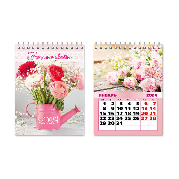 Календарь 'Нежные цветы' не только красив, но и практичен. Пластиковая пружинная обвязка обеспечивает легкость в листании страниц, а компактный размер 10х14 см позволяет разместить его на любом столе или стене. Этот календарь станет отличным подарком для друзей и близких, а также прекрасным дополнением к вашему интерьеру.