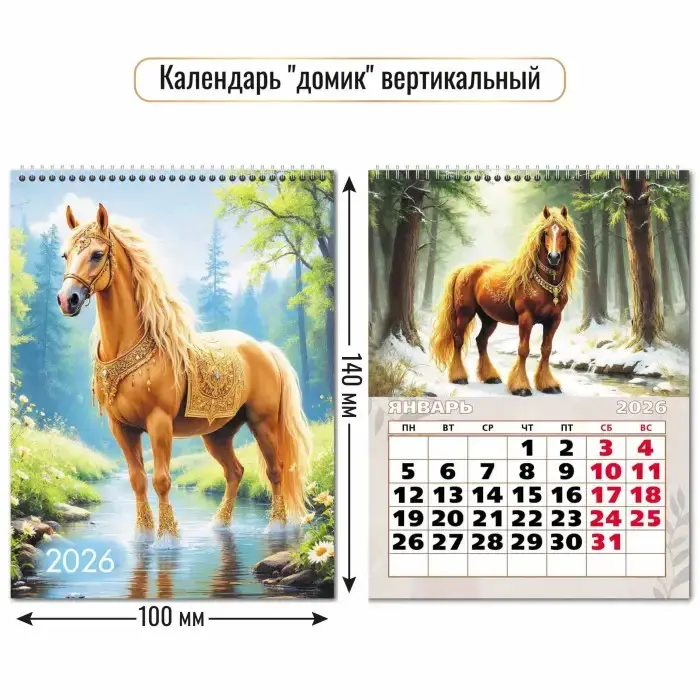 Календарь-домик вертикальный 2026 станет не просто функциональным аксессуаром на вашем рабочем столе, но и источником ежедневного вдохновения. Изящные иллюстрации благородных лошадей создают атмосферу гармонии и природной красоты.