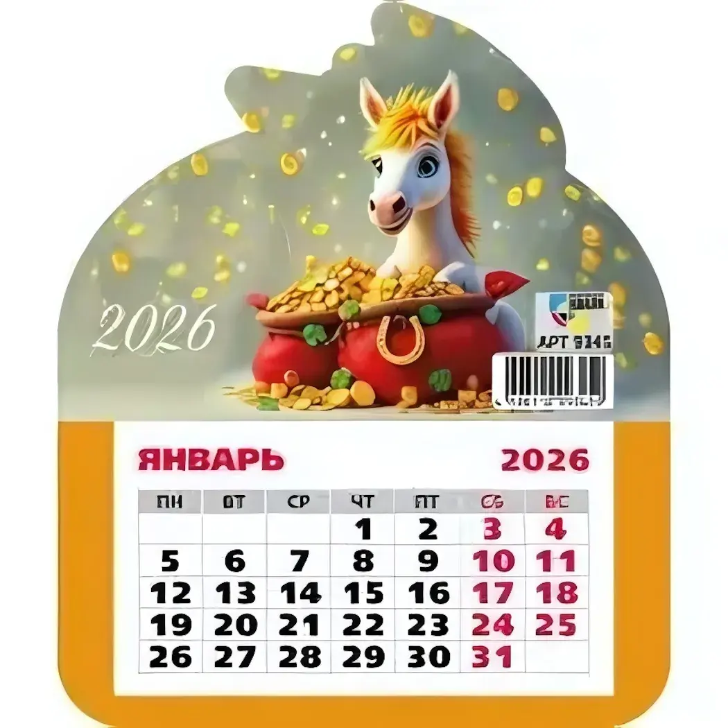 Добавьте в свой дом уют и атмосферу праздника с фигурным календарём на магнитной основе. Этот календарь 2026 года выполнен в виде грациозной лошади — символа наступающего года, что делает его не только практичным, но и декоративным элементом. Он легко крепится на холодильник, металлическую доску или любую другую магнитную поверхность, помогая всегда держать даты под рукой.