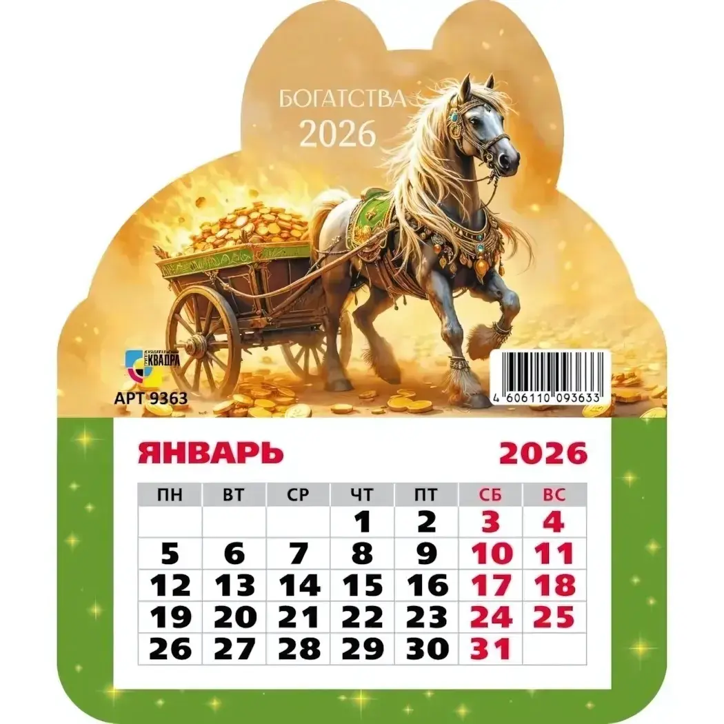 Пусть каждый месяц приносит ощущение процветания: наш фигурный магнитный календарь сочетает яркий символ года – лошадь, везущую тележку с золотыми монетами, и удобство ежедневного планирования.