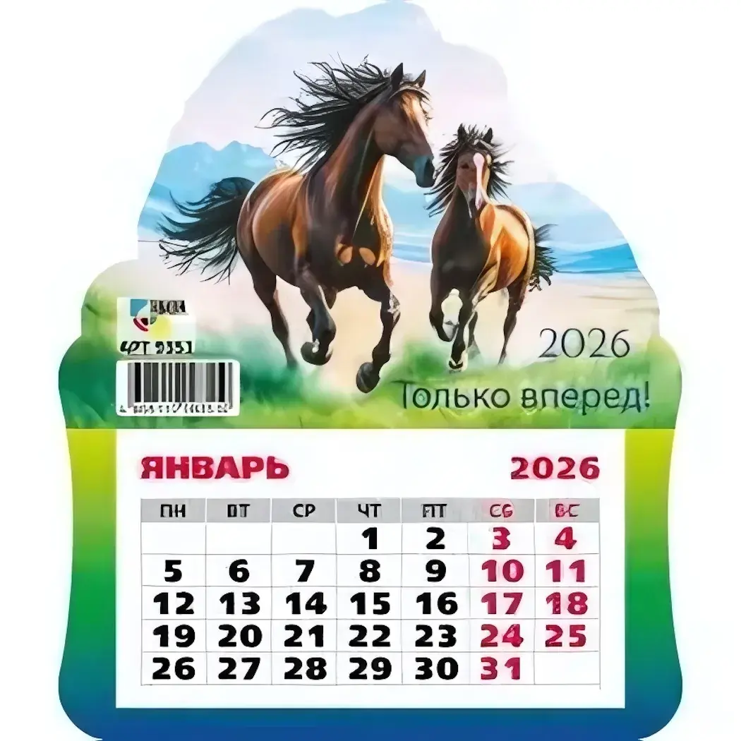 Добавьте в свой дом атмосферу движения и вдохновения с фигурным магнитным календарем 2026 года, оформленным изображением двух бегущих лошадей на фоне живописных гор. Лозунг «Только вперёд!» задаёт настроение на весь год, напоминая о силе, целеустремлённости и энергии нового периода.