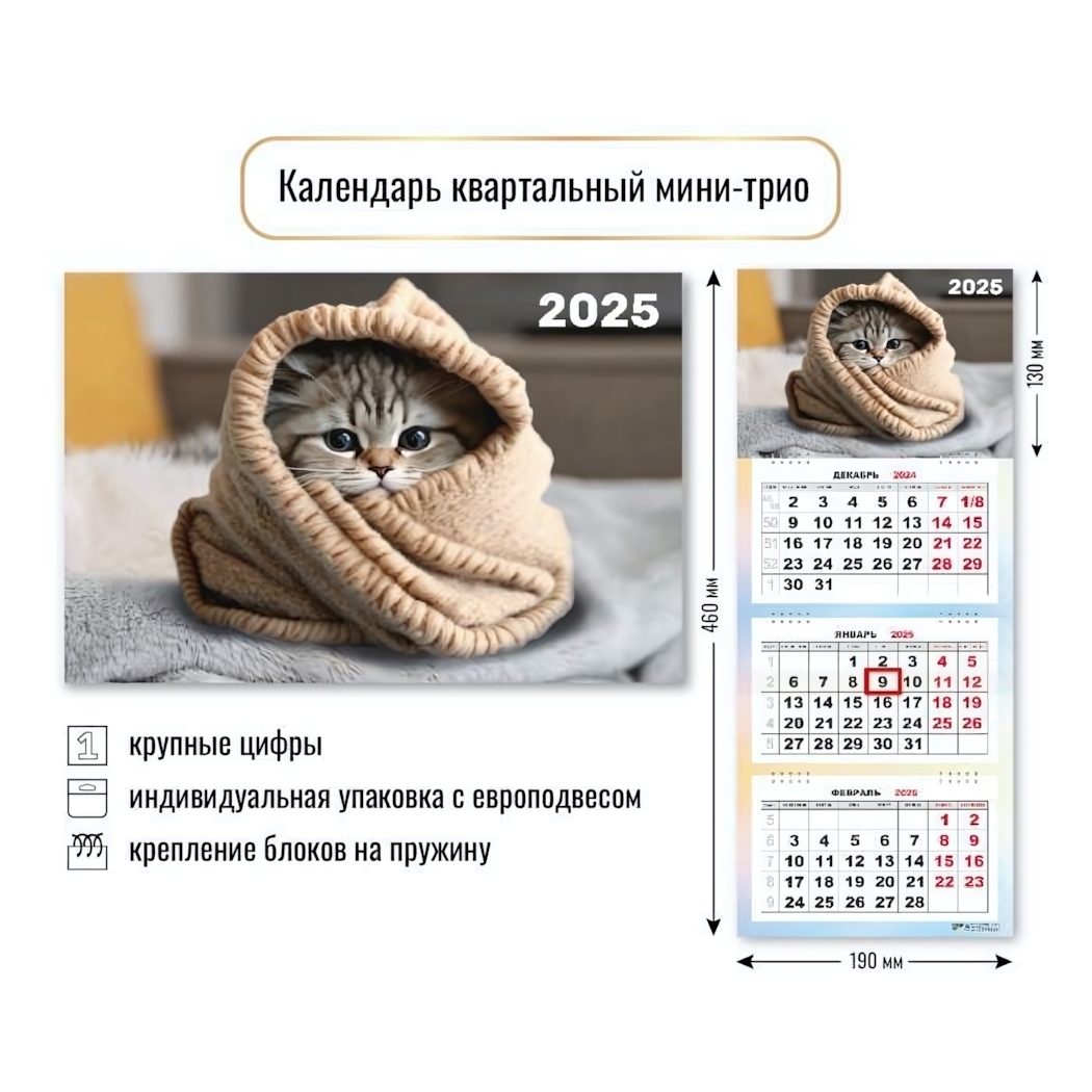 Календарь мини-трио 2025 с милым котенком в текстиле сочетает функциональность и уютный дизайн. Крупные цифры с четкой печатью позволяют быстро ориентироваться в датах, а металлическая пружина обеспечивает плавное перелистывание месяцев.