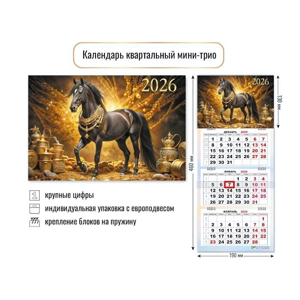 Черный конь на золотистом фоне создает атмосферу роскоши и успеха. Благодаря крупным цифрам и четкой структуре легко ориентироваться в датах.