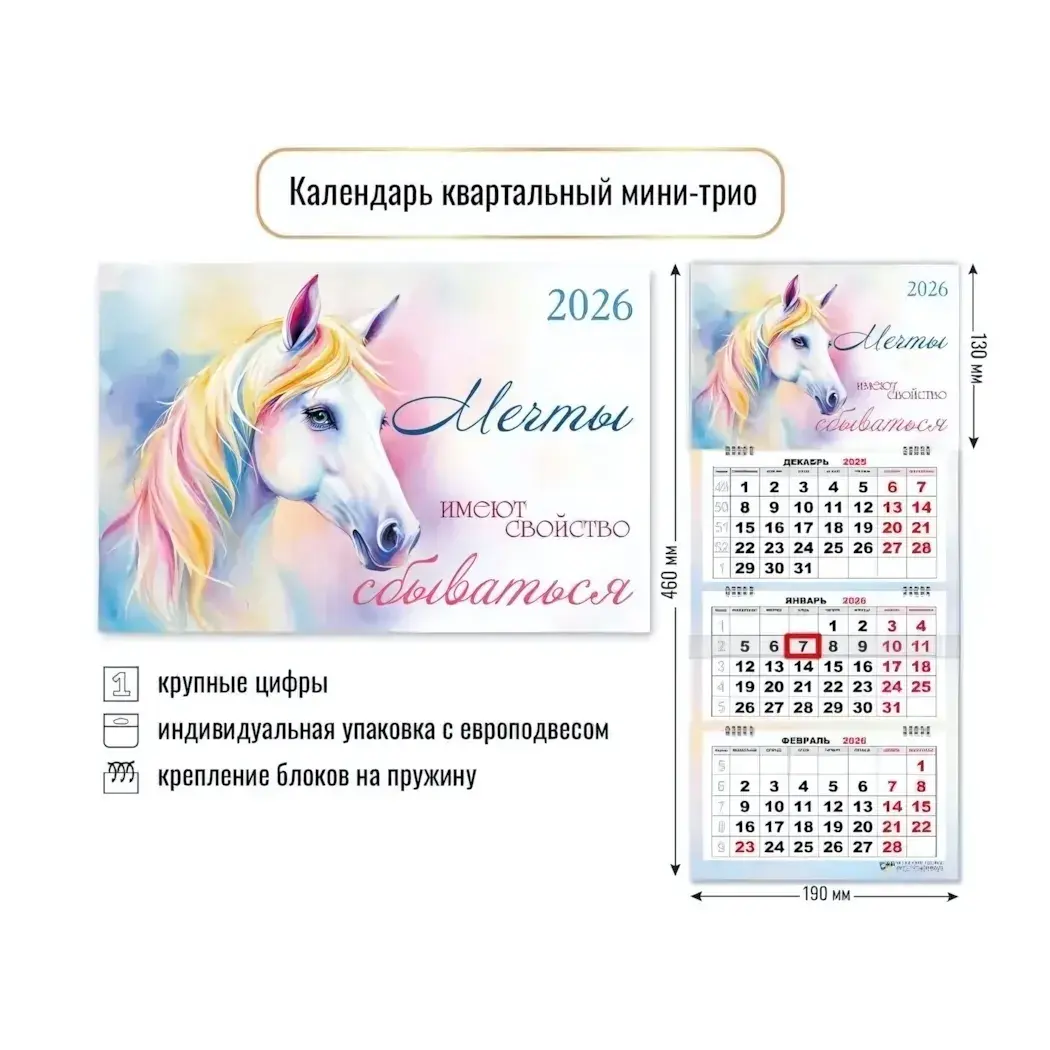 Планируйте свой год с вдохновением! Квартальный календарь мини-трио на 2026 год с символом года — радужной лошадью в нежных пастельных тонах станет не только практичным помощником, но и стильным украшением вашего рабочего места или дома.