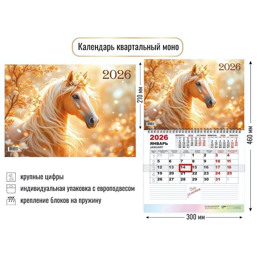 Верхняя часть украшена художественным изображением символа года — бело-рыжего коня, что делает календарь не только функциональным, но и декоративным элементом интерьера.