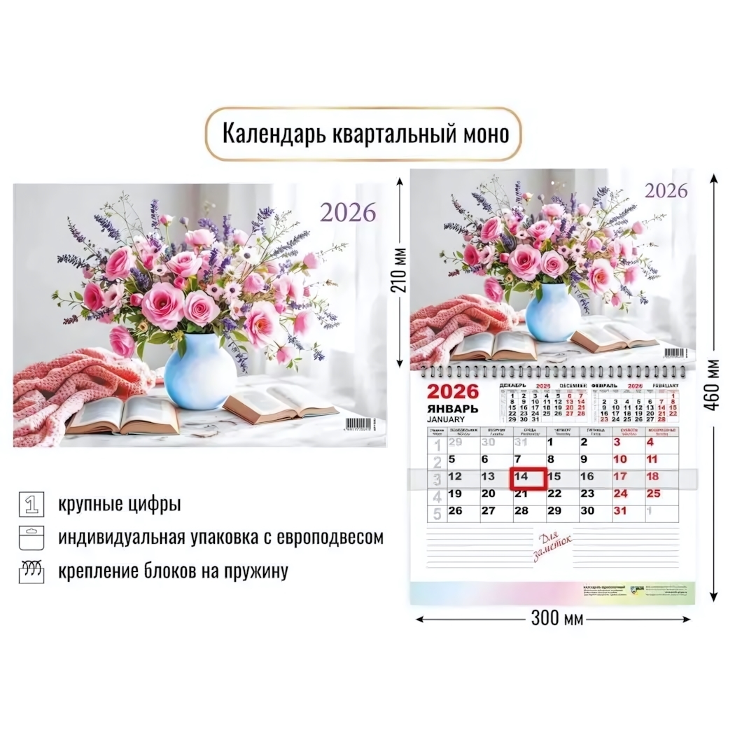 Настенный календарь 'Цветы' создан для тех, кто ценит красоту и практичность в повседневной жизни. Его элегантный цветочный дизайн станет не только функциональным элементом планирования, но и стильным акцентом в интерьере.