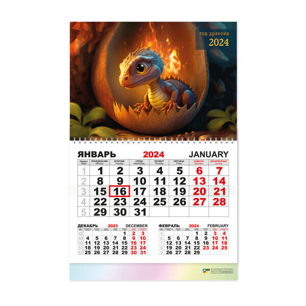 Размер календаря составляет 30х46 см, что делает его компактным и удобным для размещения на столе или стене. Внизу календаря указаны месяцы: декабрь 2023 и январь-февраль 2024, что позволяет вам заранее планировать важные события. Не упустите возможность сделать свой 2024 год ярким и запоминающимся с нашим календарем «Дракон-Яйцо»!