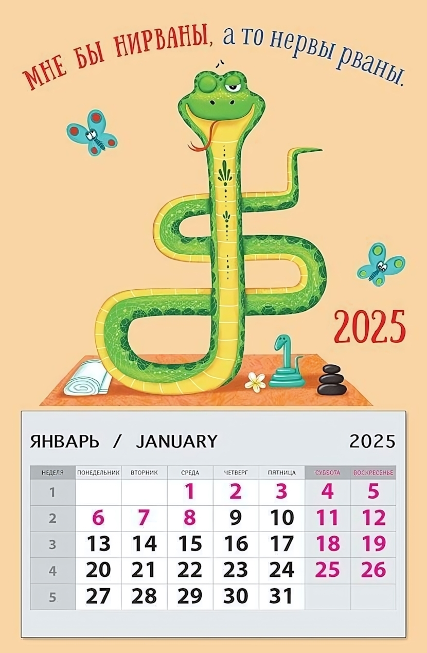 Календарь на магните 95х145, "Мне бы нирваны", 2025, с иллюстрацией змеи
