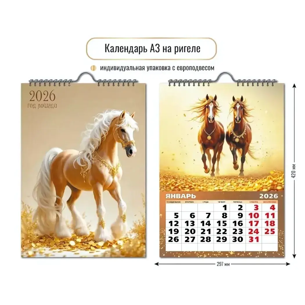 Календарь на ригеле 2026, формат А3, картон, 'Сказочные лошади', размер 297х420мм