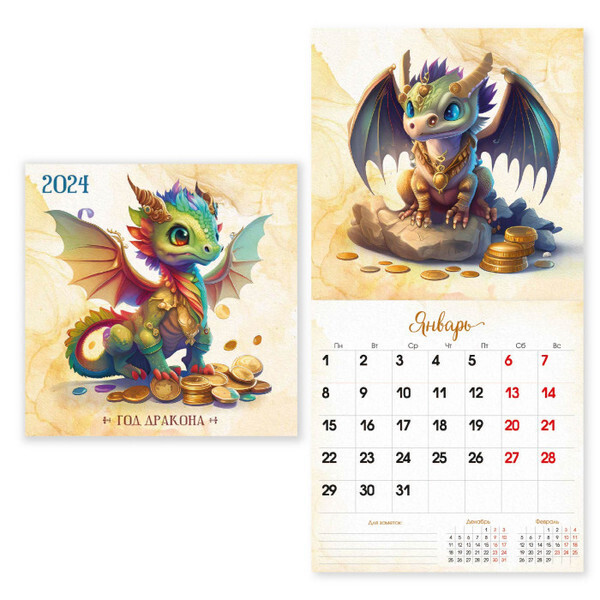 Погрузитесь в атмосферу нового года с нашим уникальным календарем на скрепке 2024, который станет не только практичным помощником, но и стильным элементом декора. Изображение дракона, сидящего на горе монет, с золотыми аксессуарами, добавляет особую магию и символику в ваш дом. Этот календарь не просто показывает даты, он вдохновляет на новые свершения и приносит удачу в год Дракона.