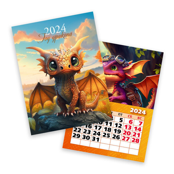 Календарь содержит календарные даты на 2024 год с сокращенными названиями дней недели: Пн, Вт, Ср, Чт, Пт, Сб, Вс. На первой стороне вы найдете изображение дракона с большими глазами и зелеными крыльями, а на второй стороне — другого дракона в очках и рюкзаке. Этот календарь станет не только полезным инструментом, но и оригинальным элементом декора, который поднимет настроение вам и вашим близким.