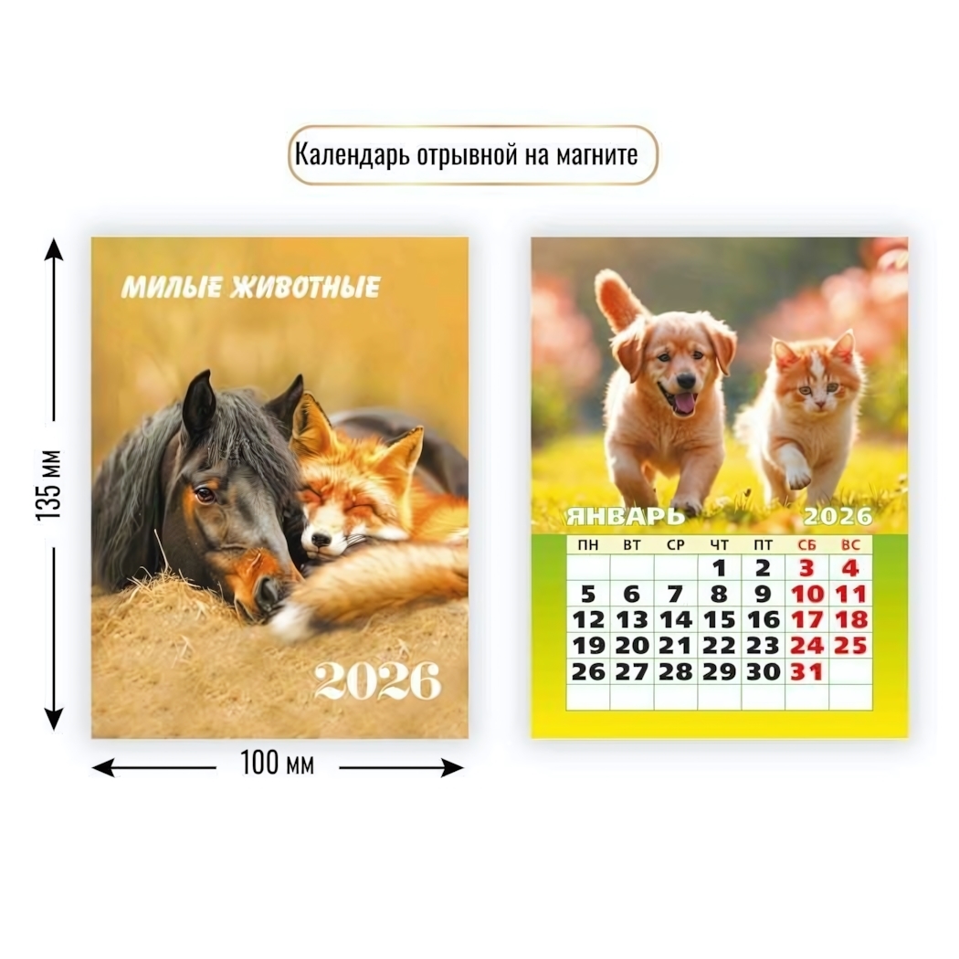 Календарь отрывной на магните 2026, размер 10х13.5см, тема 'Милые животные'