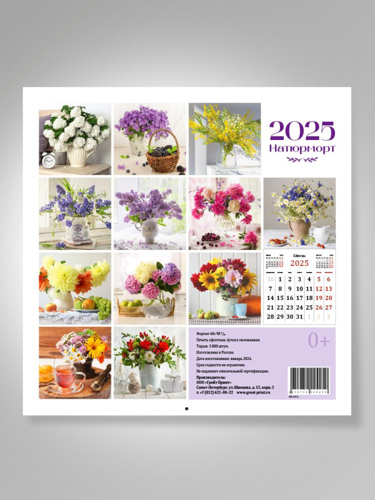 Украсьте свой дом или офис стильным перекидным календарем 'Натюрморт'. Каждый месяц радует глаз новой профессионально выполненной фотографией цветочных композиций в вазах и корзинах.