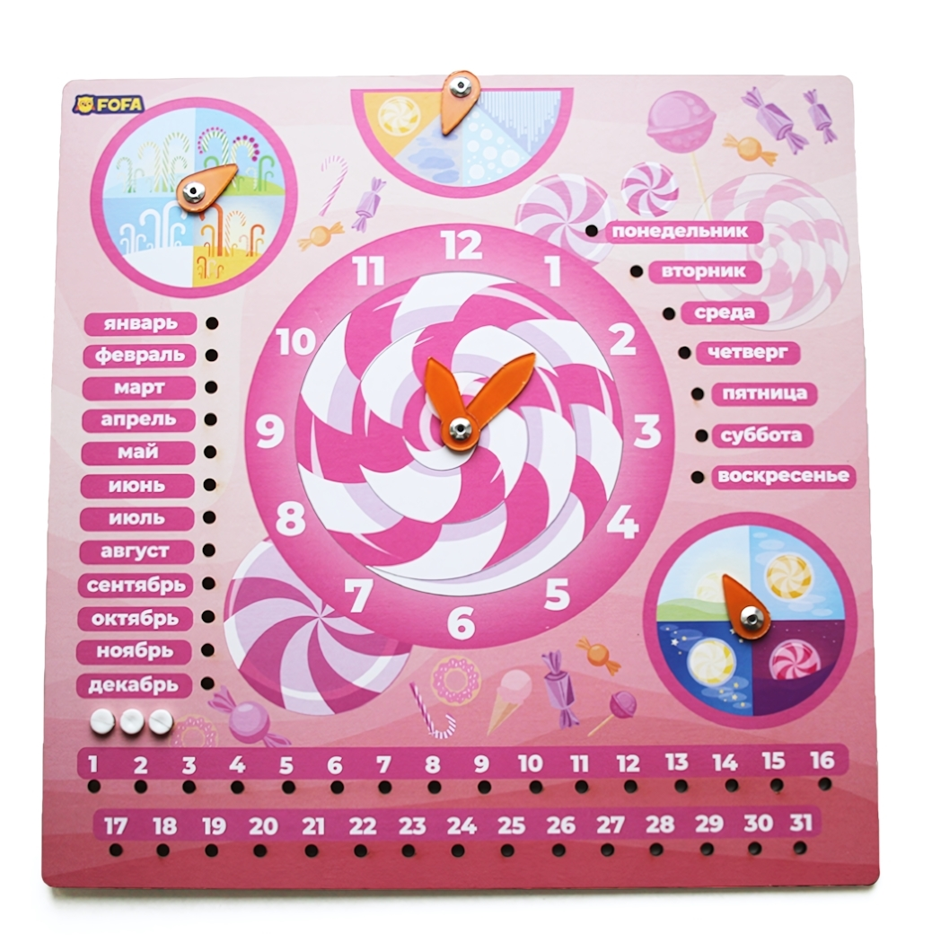 Главные преимущества этого календаря — яркий дизайн с изображениями сладостей, полностью безопасные материалы, многофункциональность и развитие навыков. Размер изделия оптимальный для для детей — он удобно размещается на стене и легко управляется малышами, а прочные материалы обеспечивают его долговечность на долгие годы. Эта игрушка стимулирует обучение через игру и помогает понять основы времени в увлекательной форме.