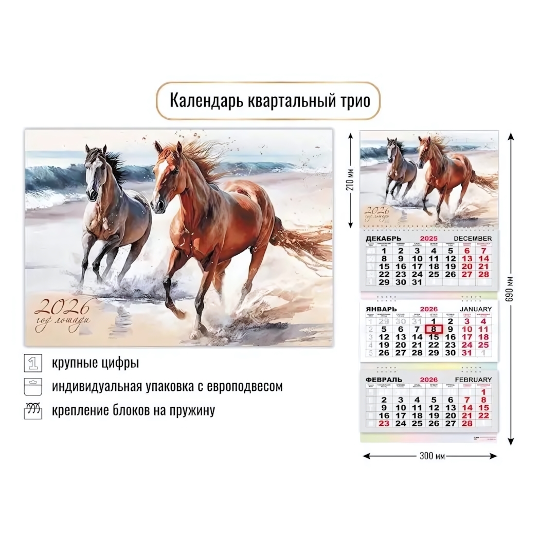 Календарь трио 2026 символ года рысаки, картон, планирование на год