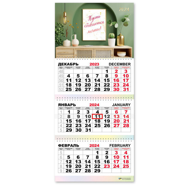 Календарь состоит из трёх листов, охватывающих декабрь 2023, январь и февраль 2024 года. Каждый месяц представлен с чёткими датами и днями недели на русском и английском языках, что делает его удобным для использования. Размеры 30х69 см позволяют разместить календарь на стене, не занимая много места, и при этом оставаясь заметным.