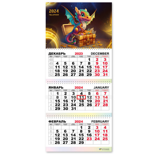 Погрузитесь в атмосферу праздника с нашим квартальным календарем на 2024 год, который станет не только практичным помощником, но и стильным элементом декора. Яркое оформление с изображением дракона, сидящего на сундуке с золотыми монетами, добавит волшебства в ваш дом и создаст настроение для новогодних праздников.