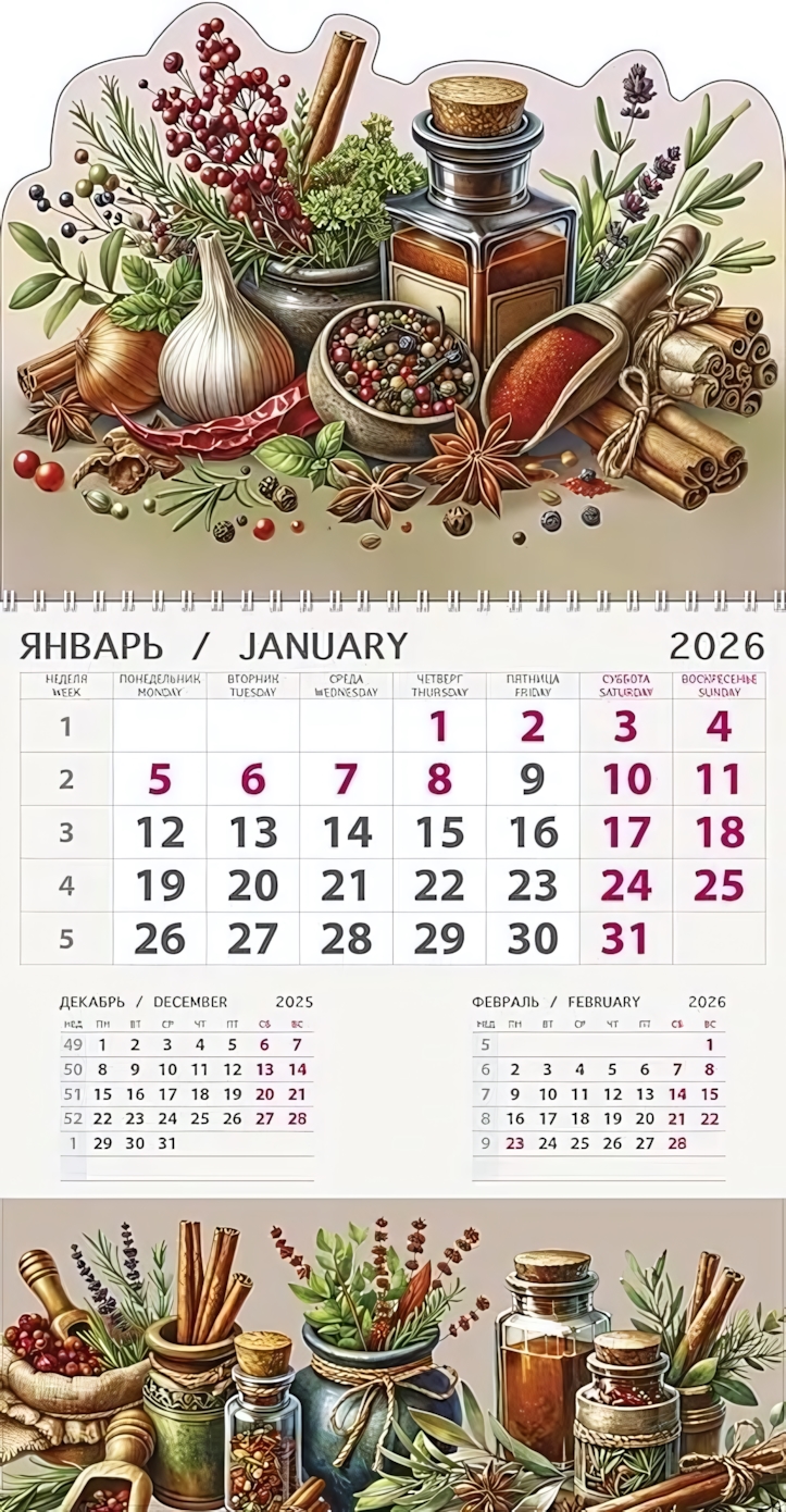 Начните каждый день с улыбки благодаря оригинальному дизайну: в январе вас встречает кот, держащий букет цветов, а остальные месяцы украшают вкусные кухонные ингредиенты – чеснок, корица, специи. Яркие краски и дружелюбные иллюстрации создают атмосферу уюта и вдохновляют на новые идеи.
