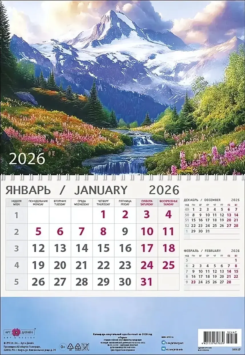 Украсьте стену ярким изображением горного пейзажа и держите под рукой четкую сетку дат — идеальное сочетание эстетики и практичности. Такой календарь помогает быстро ориентироваться в расписании, экономит время и создаёт уютную атмосферу в доме или офисе.