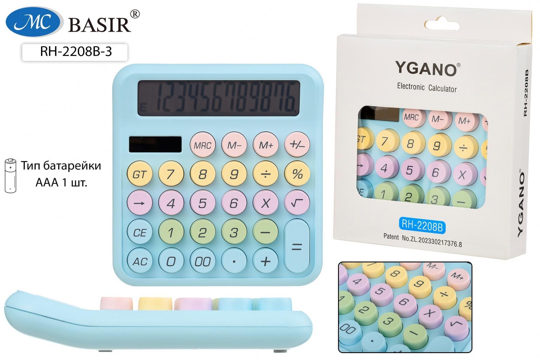 Калькулятор Basir RH-2208B, двойное питание, голубой с разноцветными кнопками, 15.4x14.6x2.6 см