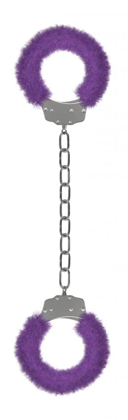 Общая длина изделия в собранном виде составляет 65 см. Внешняя часть выполнена из прочного металла серебристого цвета, внутренняя – из мягкого меха фиолетового оттенка. Соединительная цепь состоит из нескольких одинаковых звеньев, обеспечивая гибкость и мобильность. Дизайн лаконичен и лишён лишних деталей, что делает кандалы лёгкими в уходе и хранении.