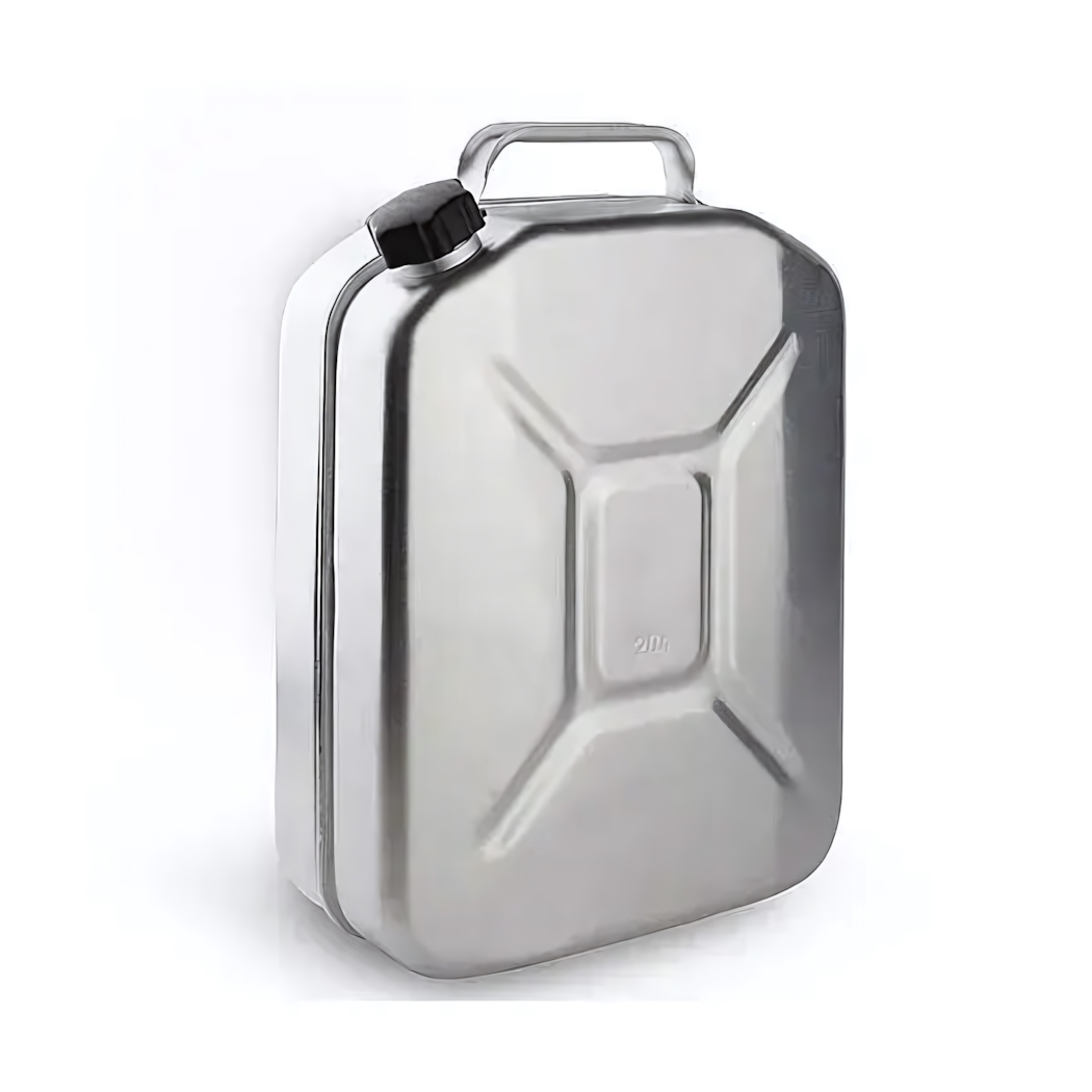 Канистра с серебристым покрытием органично впишется в дачный интерьер или гаражное пространство. Закругленные углы конструкции и усиленное дно обеспечивают устойчивость на любой поверхности. Геометрический рельеф корпуса повышает жесткость конструкции без увеличения веса.