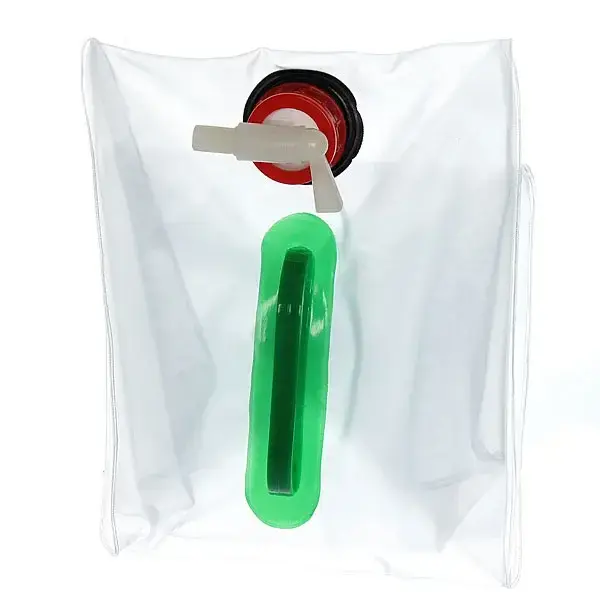 Особенности конструкции: усиленные швы по периметру, защитная крышка с резьбой, съёмный кран с фиксатором. Размеры в сложенном состоянии: 25×15×5 см. Вес пустой канистры: 450 г. Цветовая гамма: прозрачный корпус с зелёными акцентами.