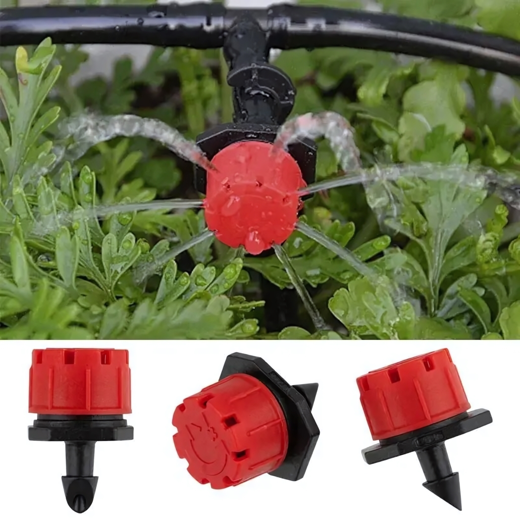 Комплектация включает 25 идентичных устройств с красными регулировочными колпачками. Совместимы со стандартными системами полива и фитингами. Материалы: ABS-пластик корпуса, нержавеющая сталь крепежных элементов.
