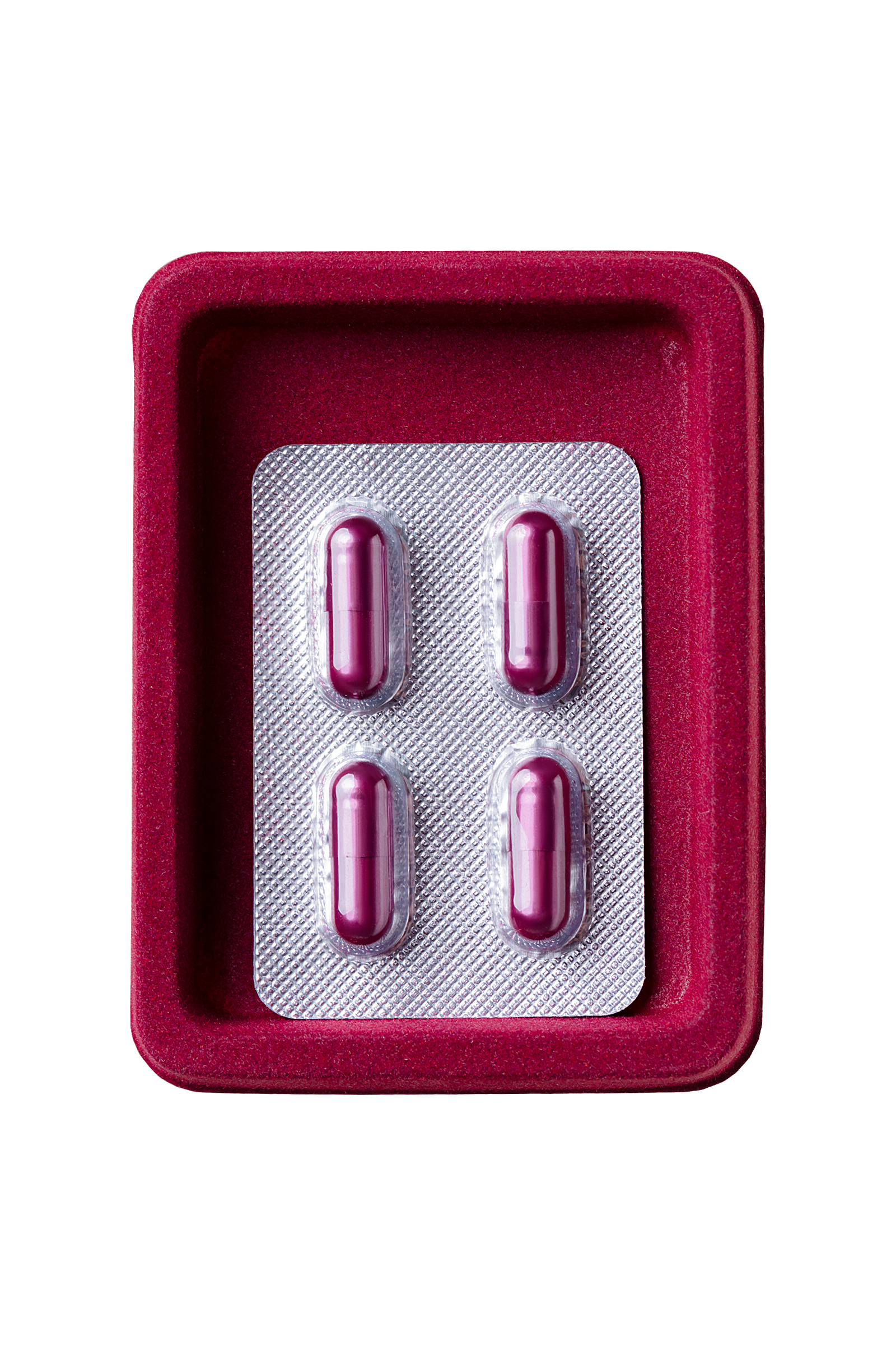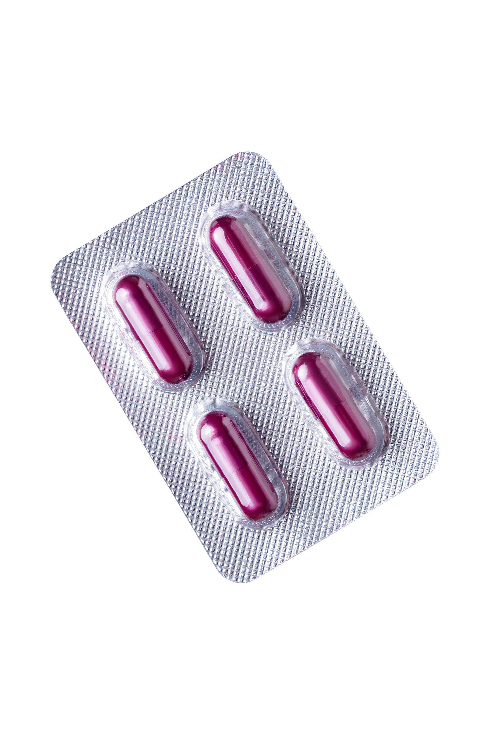 Коробка содержит четыре капсулы, каждая по 350 мг, что позволяет точно дозировать прием. Капсулы имеют продолговатую форму с закругленными концами, цвет насыщенный пурпурный. Упаковка компактная, подходит для хранения в аптечке или сумке. Объем каждой капсулы подобран для оптимального усвоения активных веществ.