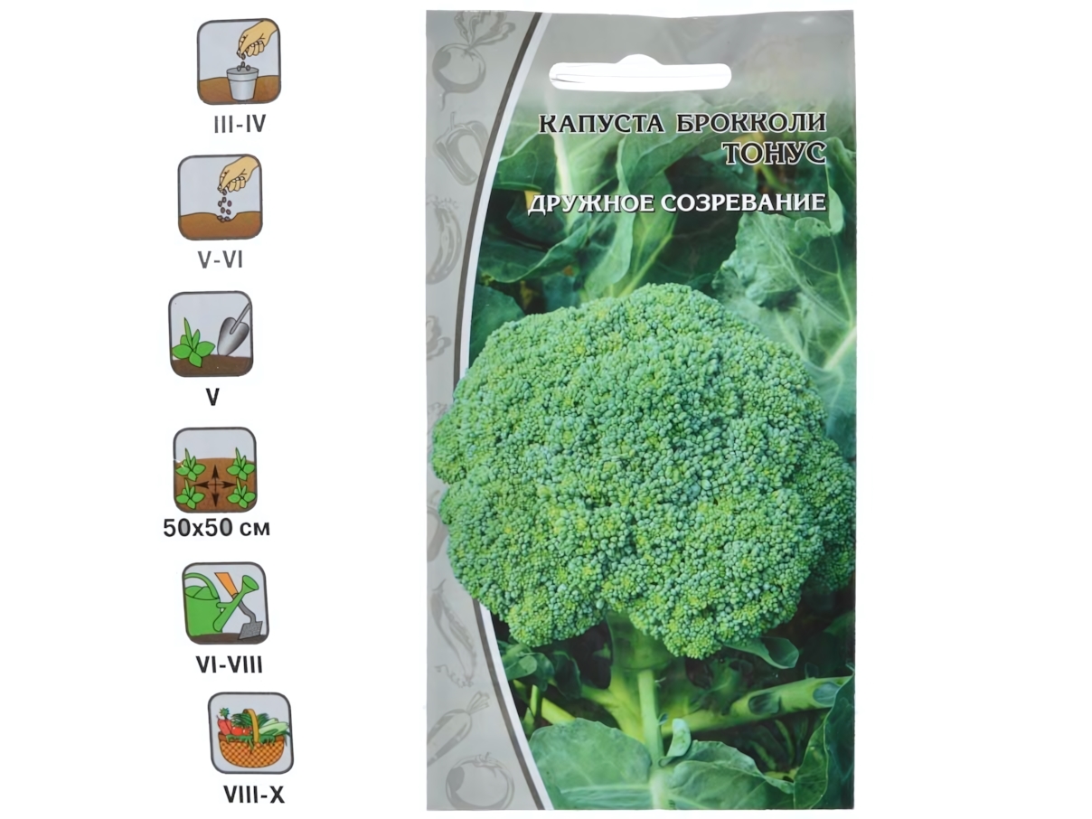КАПУСТА брокколи Тонус скороспелый (0,5г) Цв.пак. (10шт) • скороспелый (60-89 дней) сорт для получения раннего урожая • головки эллептические, темно-зеленые, среднебугристые, массой 160-200 г • используют в вареном виде, для консервирования и замораживания