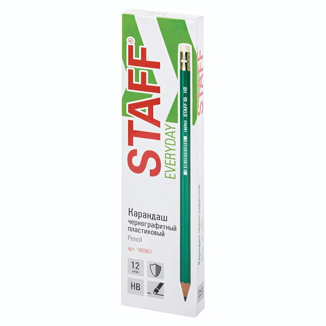 Представляем вашему вниманию чернографитный карандаш STAFF "EVERYDAY", который стал незаменимым инструментом для письма, рисования и черчения. Его стильный зеленый корпус и универсальный дизайн подойдут для детей и взрослых, а также для использования в школе, офисе или дома. Карандаш обладает средней жесткостью HB, что делает его идеальным для создания четких линий и заявлений. Ластик на конце позволит легко исправлять ошибки без следов.