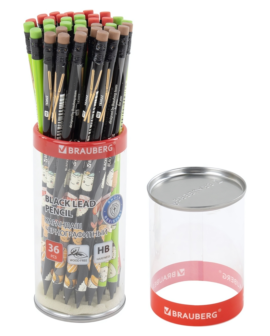 С длиной 190 мм и средней твердостью HB, карандаш легко держать в руке и быстро зачищать благодаря встроенному ластику. Появляется 36 штук в прозрачной упаковке, что удобно для хранения и подбора по цвету – ластик в зелёный, красный или коричневый.