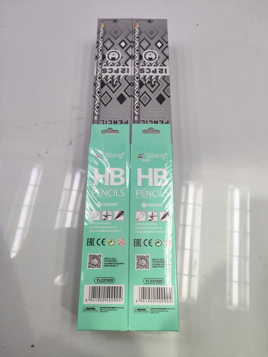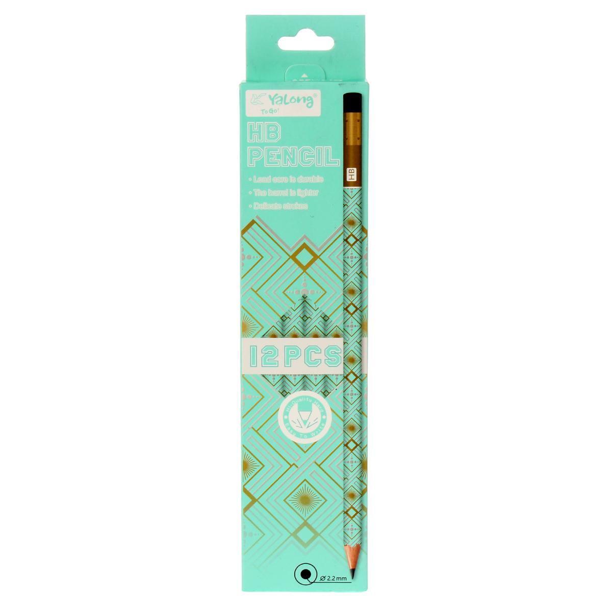 Каждый карандаш имеет длину стандартного размера и заканчивается острым грифелем черного цвета, что позволяет писать тонкие линии. Упаковка выполнена в светло-зеленом цвете с геометрическими узорами, что делает ее привлекательной и удобной для хранения. Карандаши подходят для использования в школе, на работе и в творческих проектах.