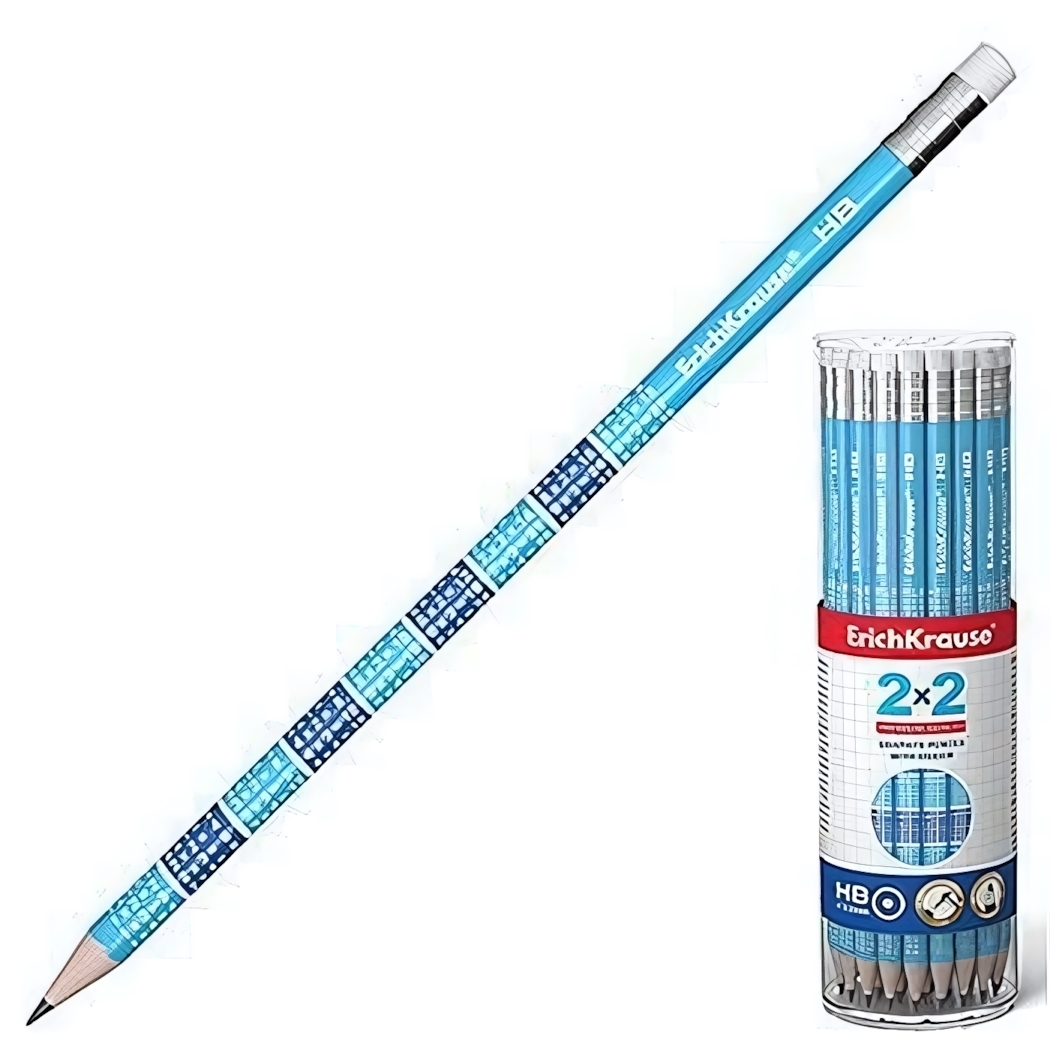 Карандаш чернографитный Erich Krause HB с ластиком, круглый, голубой, 2x2 – для школы и офиса