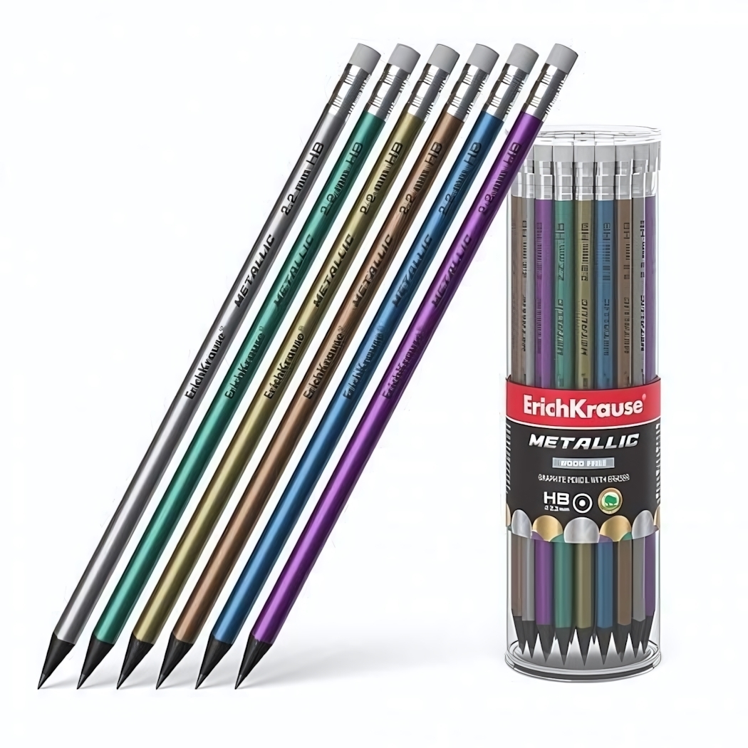 Карандаш чернографитный Erich Krause Metallic HB, биоразлагаемый пластик, 6 металлик цветов, ластик
