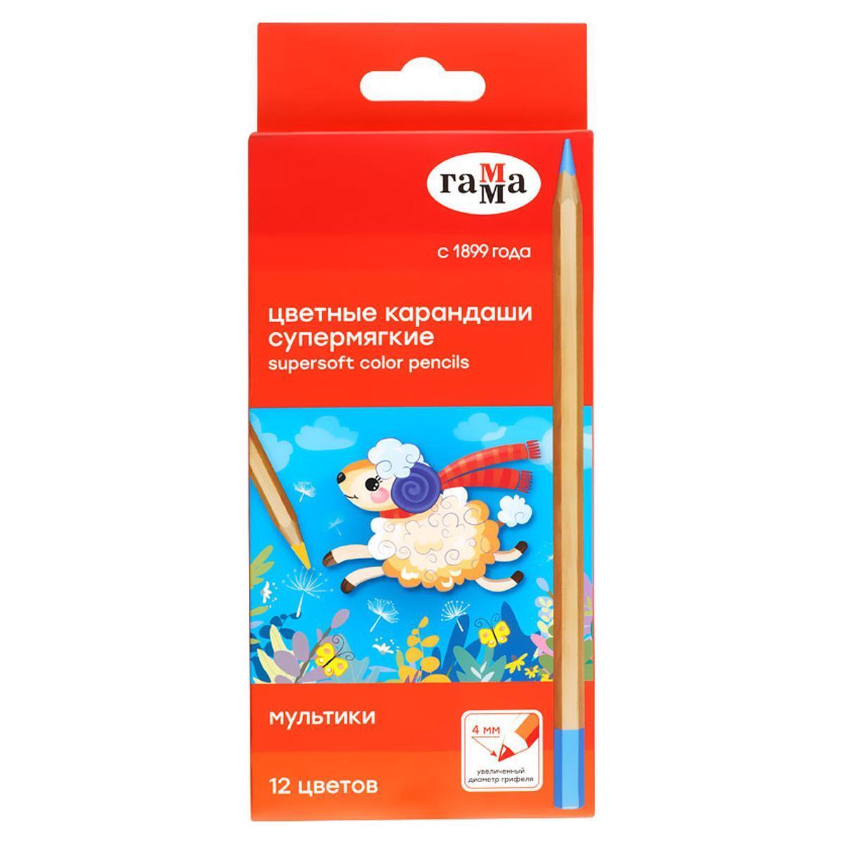 Карандаши цветные Гамма "Мультики", 12 цветов, супермягкие, 4 мм, заточенные, для рисования