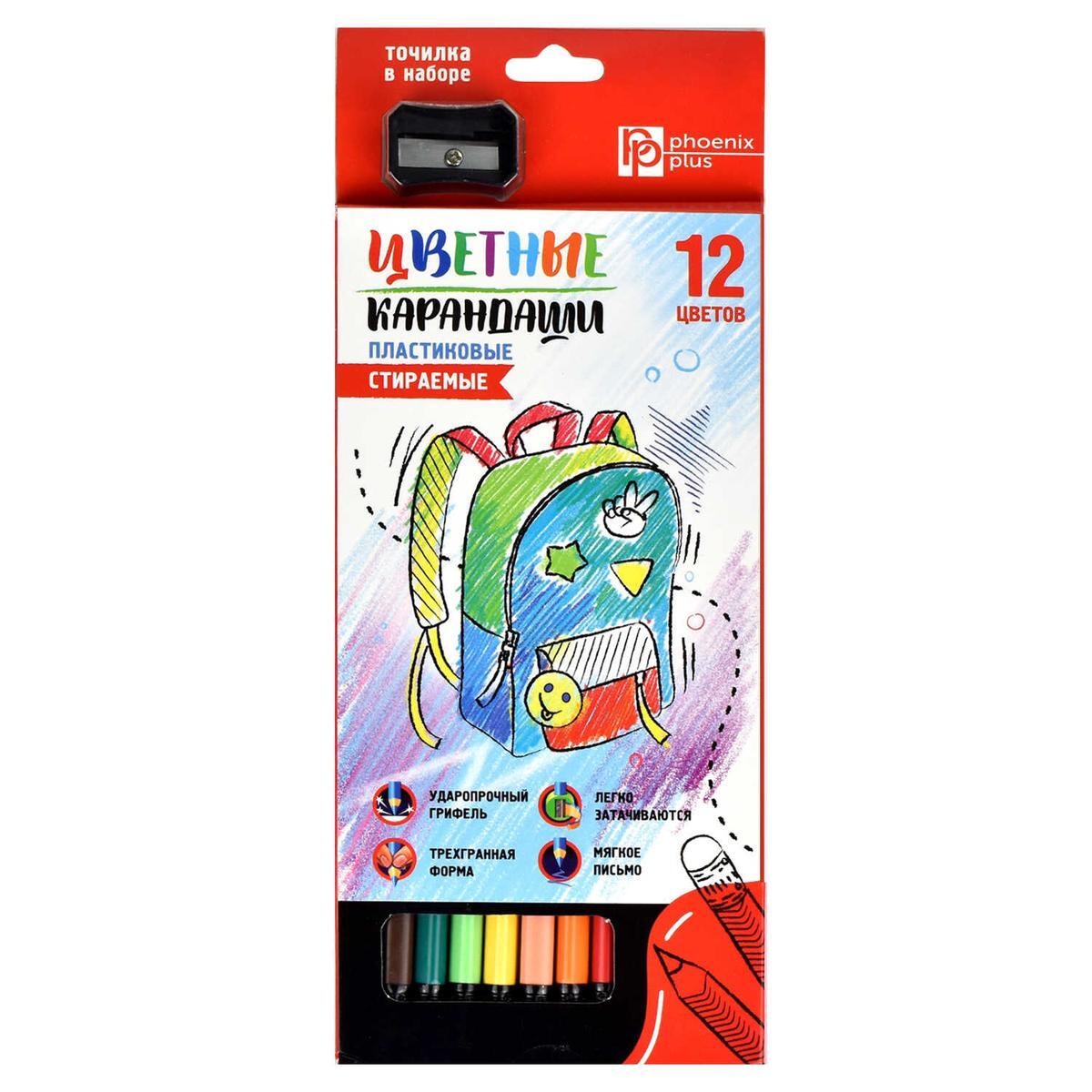 Набор цветных карандашей 12 цветов «Яркий рюкзак» с точилкой, трёхгранные, стираемые, пластик