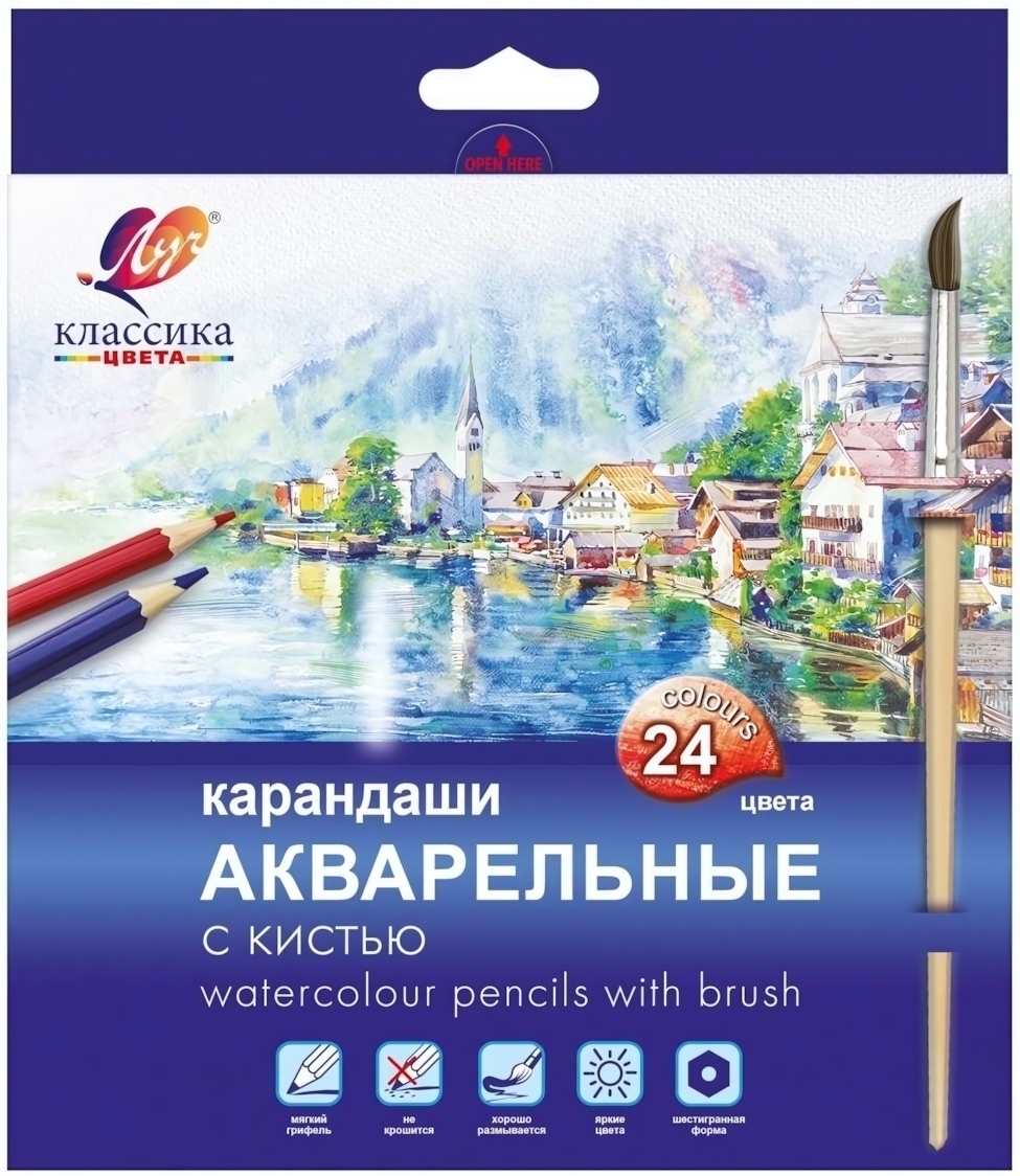 Карандаши акварельные 'Классика цвета' 24цв, с кистью, деревянные, мягкий грифель