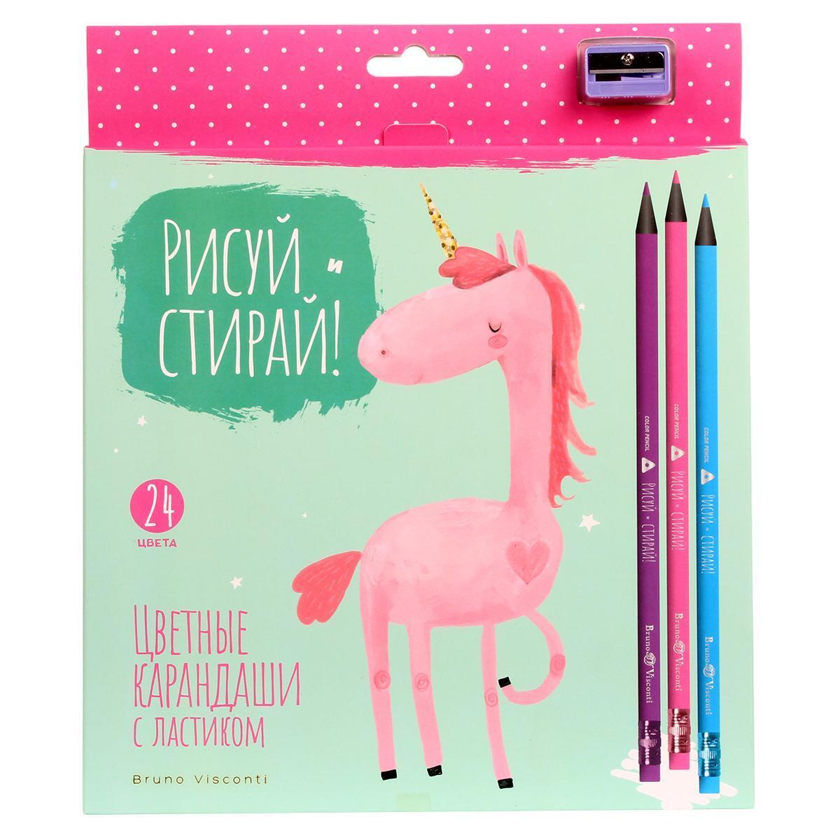 Цветные карандаши 'РИСУЙ и СТИРАЙ' 24 цвета, с ластиком и точилкой, диаметр грифеля 2.8мм