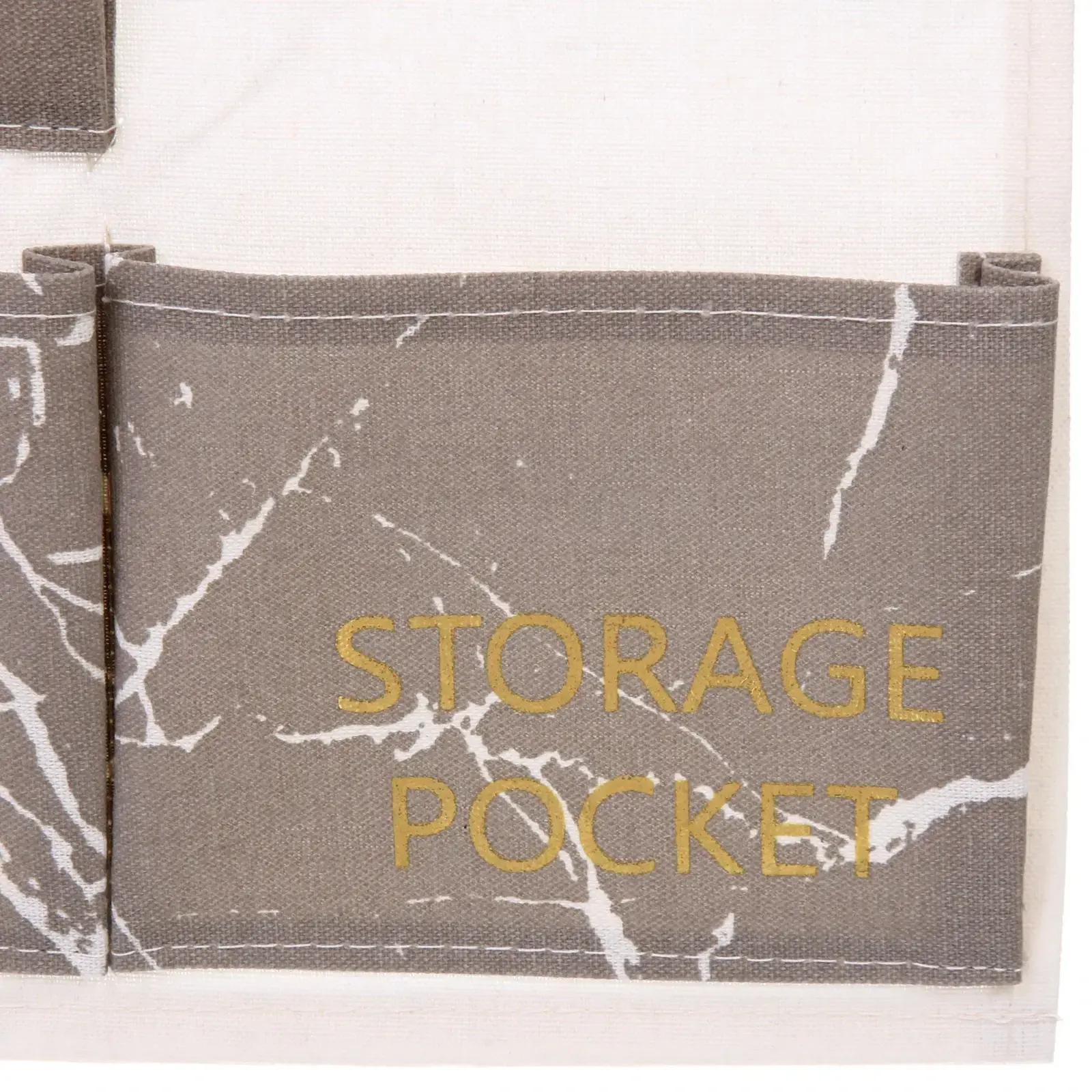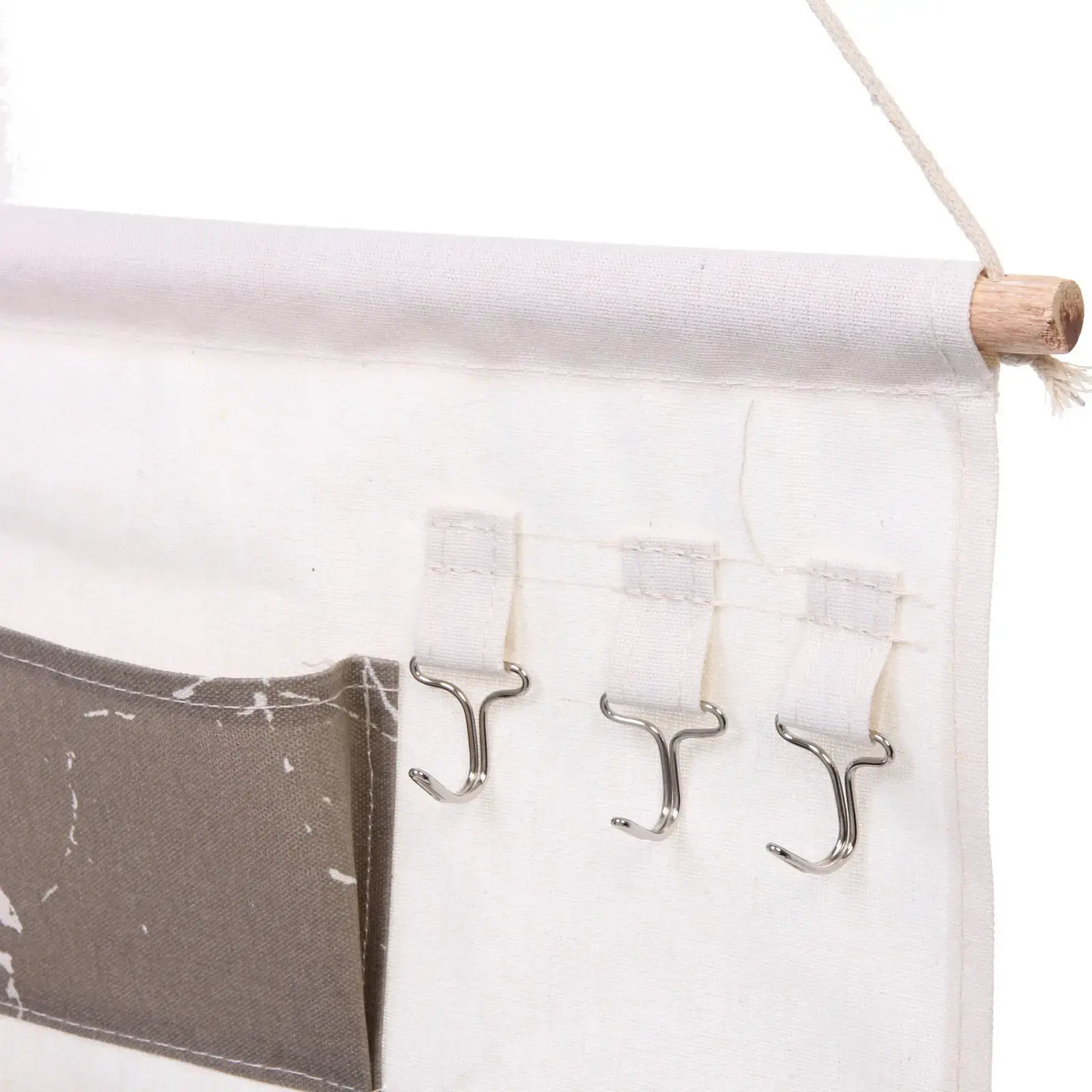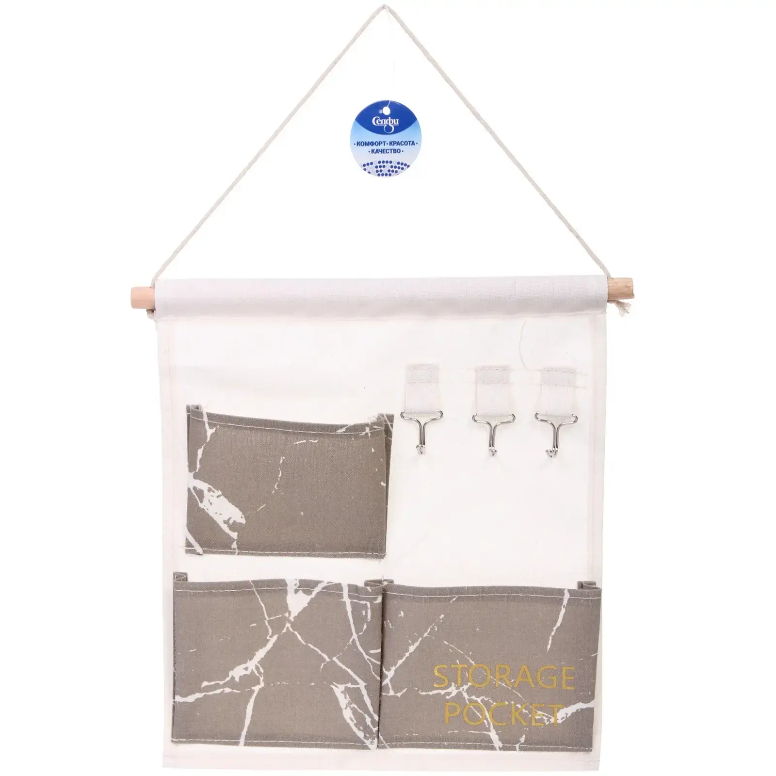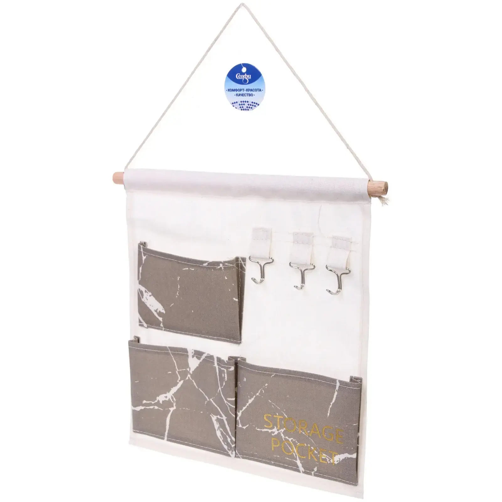 Органайзер выполнен из прочного текстиля с мраморным узором, что делает его не только красивым, но и долговечным. Он легко крепится на стену с помощью деревянной перекладины и веревочного механизма, что позволяет сэкономить место и сделать его использование максимально удобным. Три кармана различного размера идеально подходят для хранения ключей, мелочей, канцелярии и других необходимых предметов.