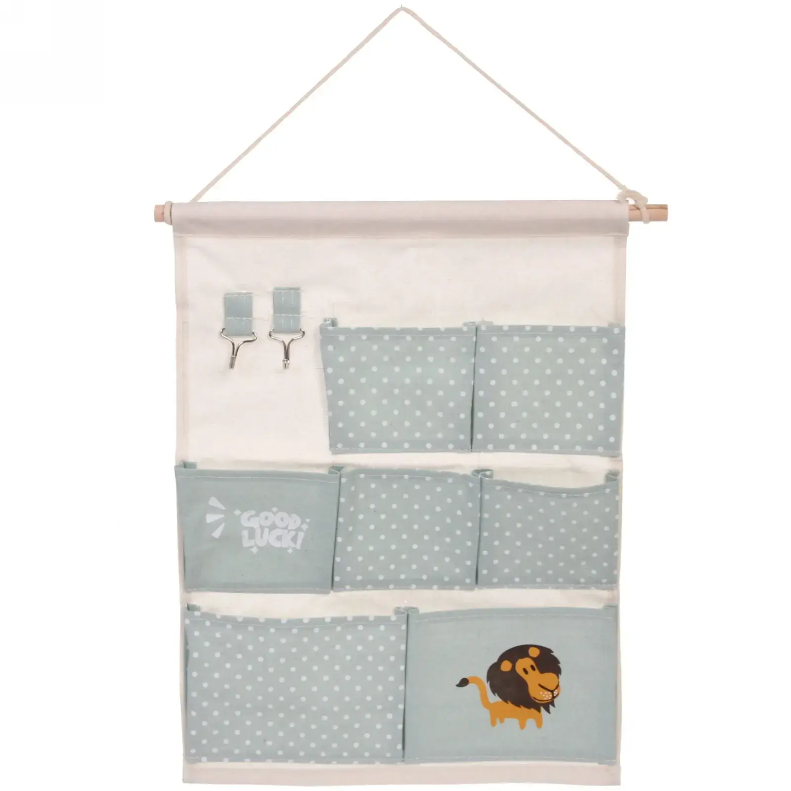 Практичный текстильный органайзер с 7 функциональными карманами поможет организовать хранение мелочей в прихожей, детской или ванной. Эргономичный дизайн с тематическим принтом льва создаёт атмосферу уюта, а надпись «GOOD LUCK!» добавляет позитивный акцент.