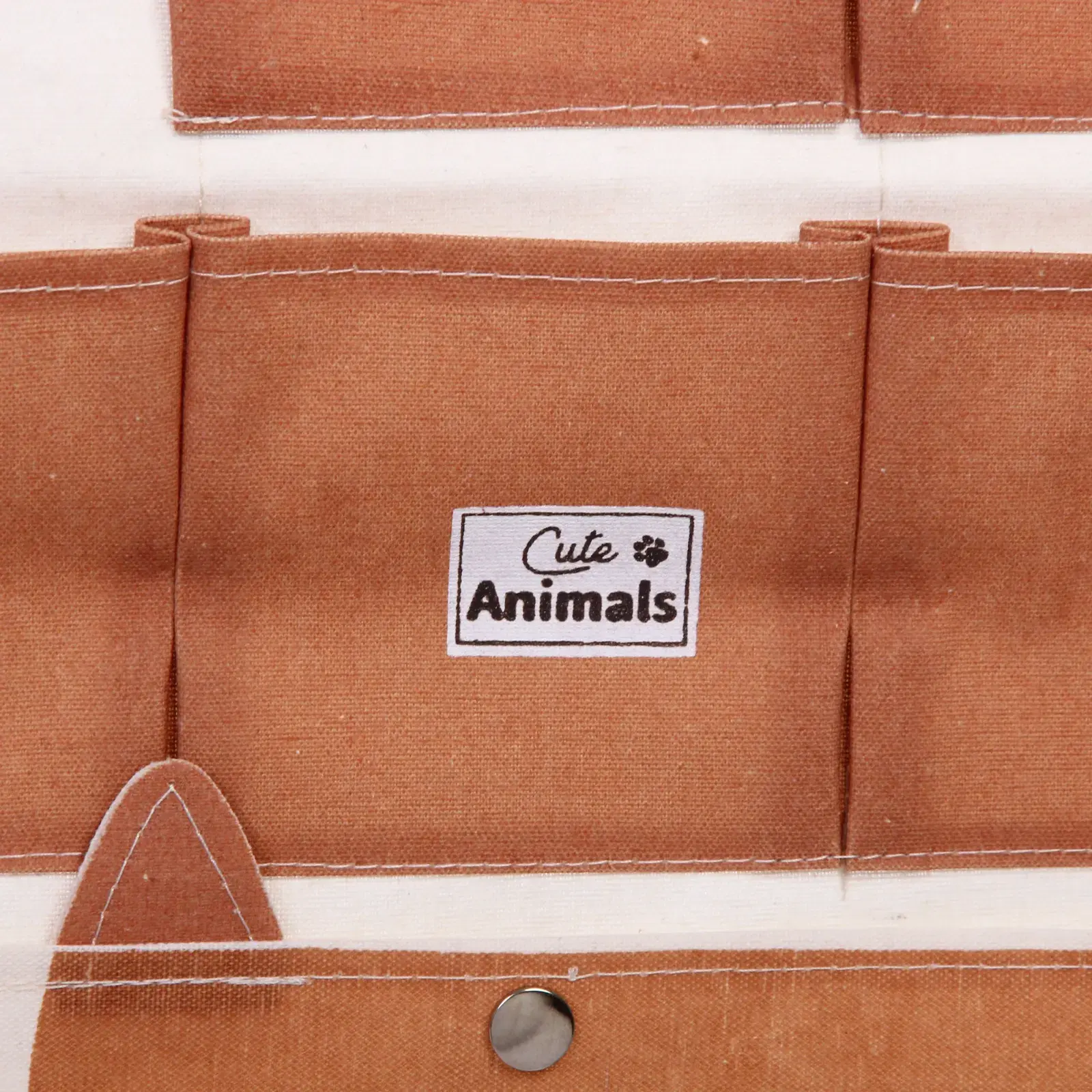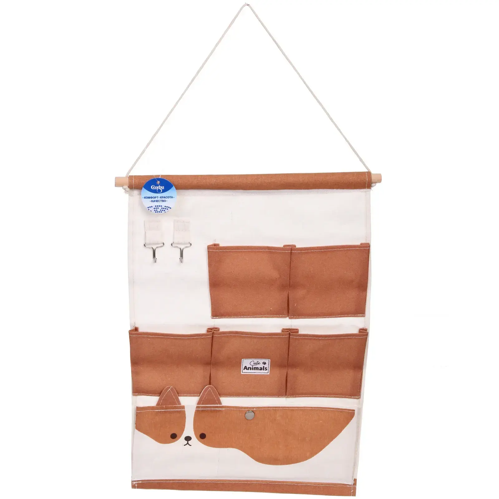 Органайзер предназначен для подвешивания и имеет шесть карманов различного размера, что позволяет удобно хранить мелкие предметы, такие как канцтовары, игрушки или аксессуары. Он легко крепится на стену с помощью деревянной планки и текстильных петель, что делает его установку быстрой и простой.