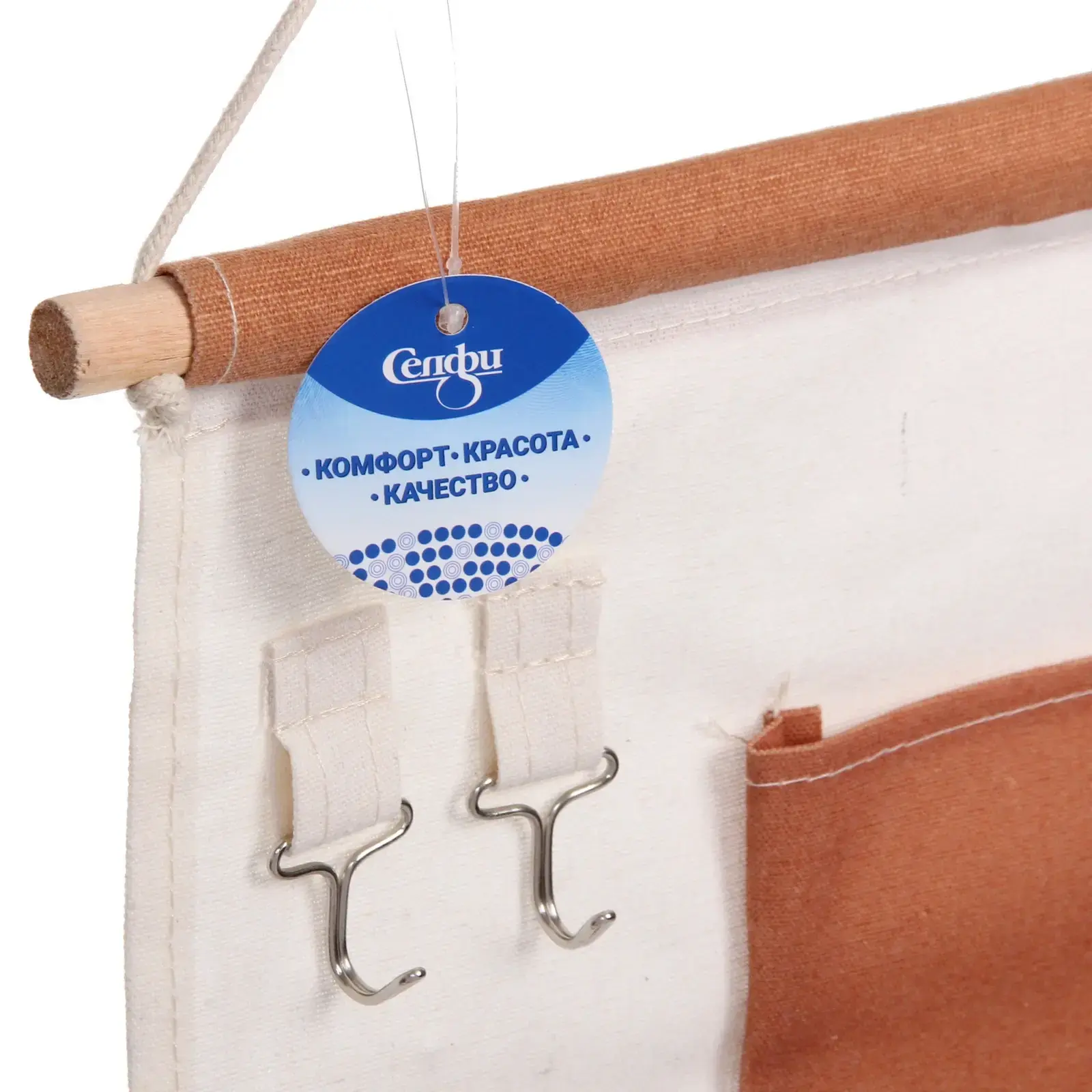 Размер органайзера составляет 35х50 см, что делает его компактным и удобным для использования в любом пространстве. Он выполнен из качественного текстиля, что гарантирует надежность и долговечность. Основной цвет — белый с коричневыми элементами, что позволяет органайзеру легко вписаться в любой интерьер.