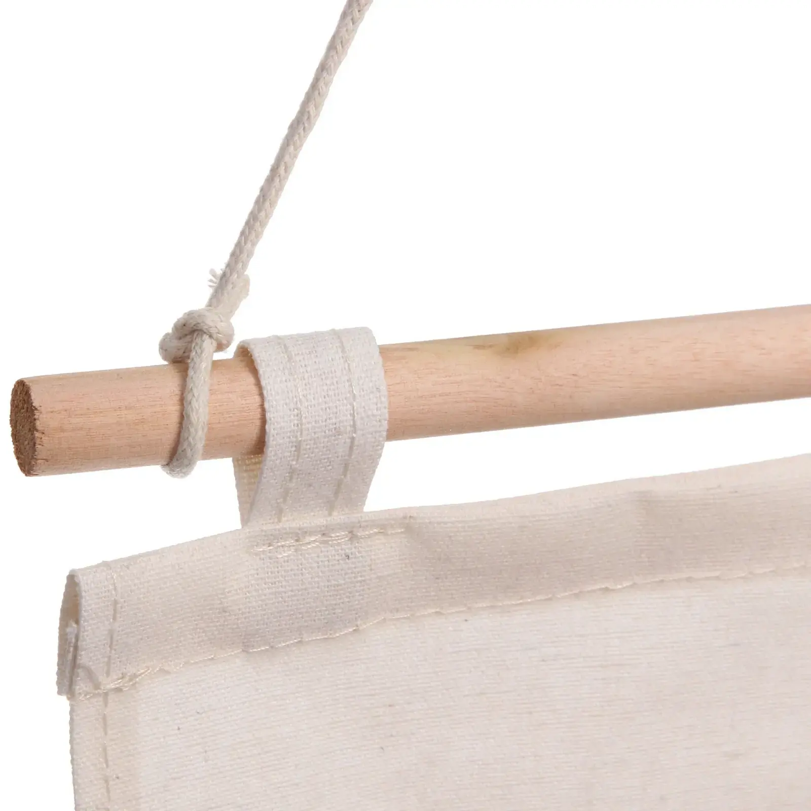 Карман имеет три секции, что позволяет удобно организовать пространство и хранить различные предметы, такие как ключи, мелкие аксессуары или канцелярские принадлежности. Он идеально подходит для использования в прихожей, детской комнате или офисе. Легко подвешивается на стену с помощью деревянной перекладины и веревки, что делает его установку простой и быстрой.