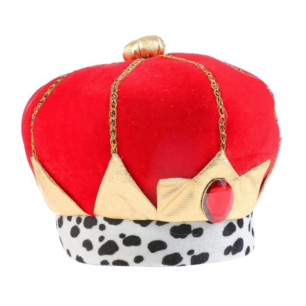 Дизайн сочетает благородство и игривость: ярко красный бархат, блестящие элементы и декоративные стразы притягивают взгляд. Материал — текстиль, что делает изделие удобным и простым в уходе. Компактная форма позволяет хранить корону вместе с другими аксессуарами.