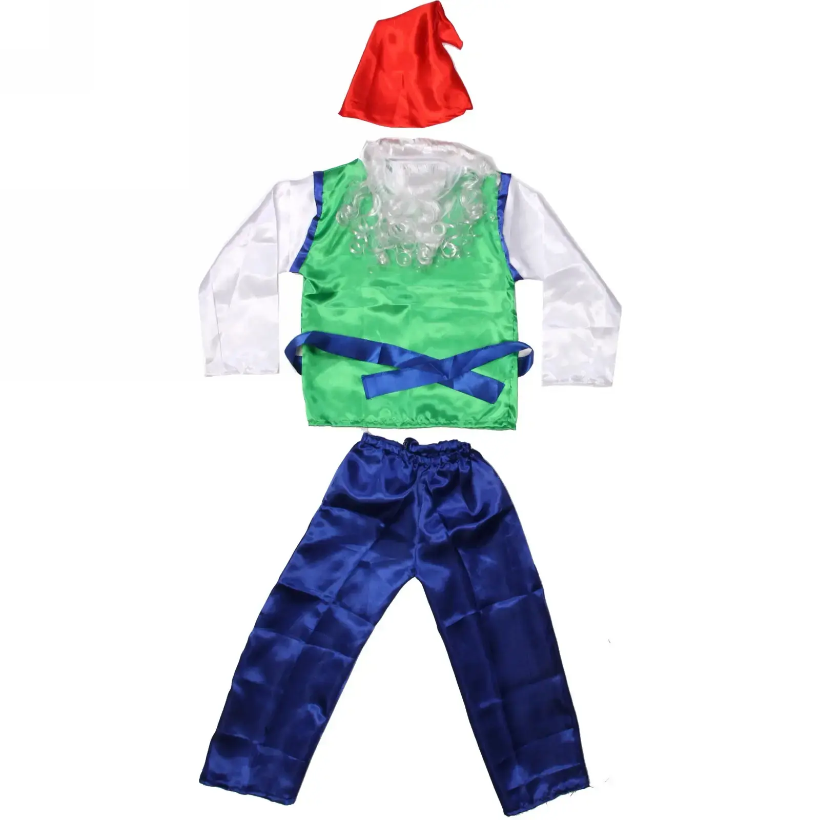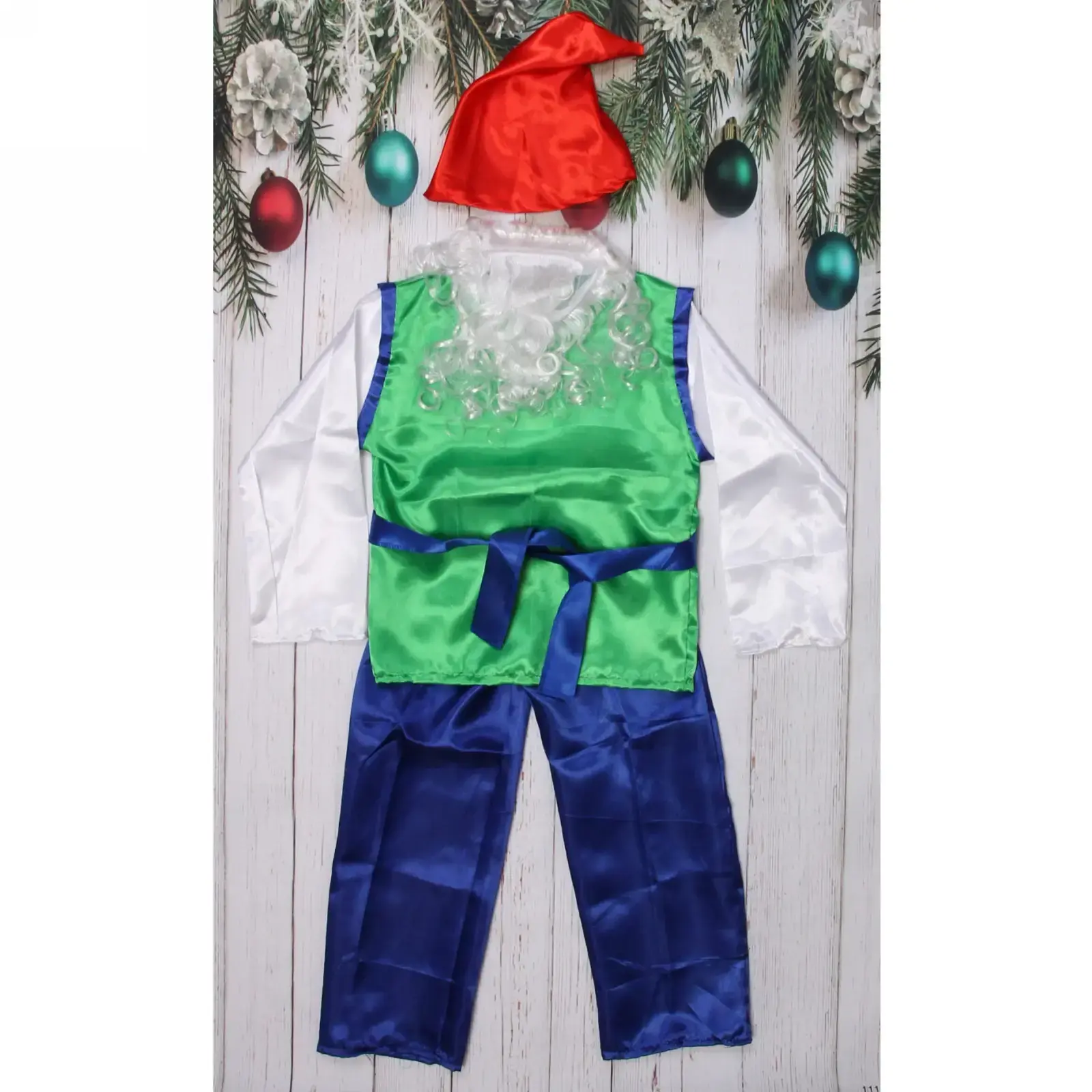 Костюм состоит из трех элементов: верхней части, штанов и головного убора. Верхняя часть выполнена в зелёном цвете с белыми манжетами и синей завязкой на талии, что обеспечивает комфорт и свободу движений. Штаны синего цвета с резинкой на поясе легко надеваются и подходят для активных игр. Красный колпак с остроконечным верхом завершает образ, добавляя ему игривости.