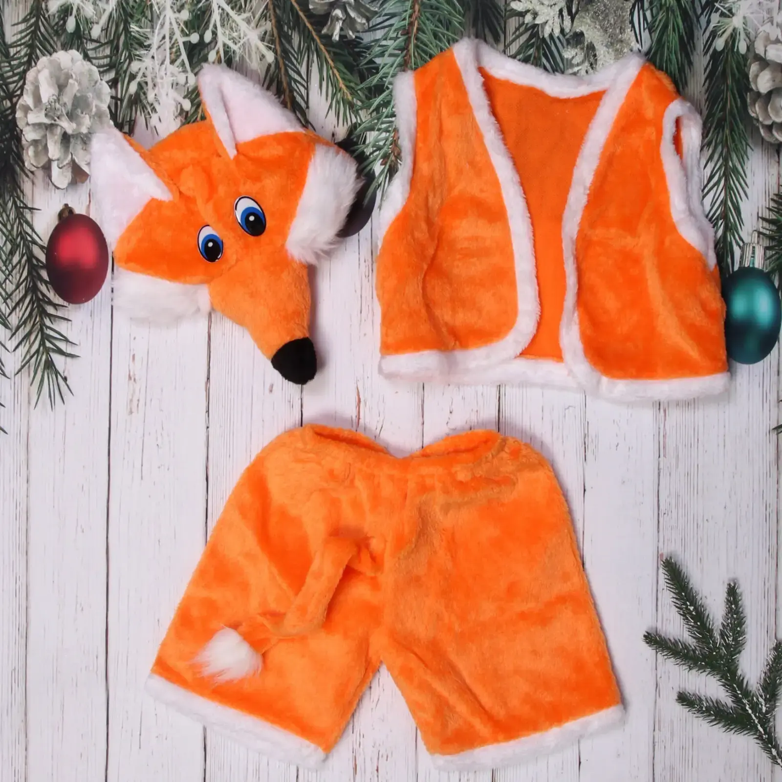 Костюм состоит из жилета, штанов и головного убора, что делает его универсальным для различных сценариев использования. Жилет без рукавов и округлой формы позволяет легко надевать и снимать костюм, а также обеспечивает свободу движений. Штаны короткие, что добавляет удобства и стиля. Головной убор в виде маски лисы с большими глазами и ушами завершает образ, делая его по-настоящему запоминающимся.